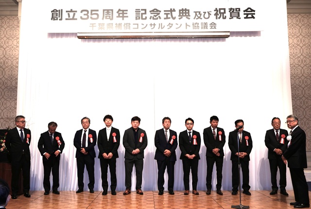 創立35周年記念式典及び祝賀会を開催しました 2026年1月13日 最終更新日時 : 2026年1月16日 ccca 令和7年11月13日(木)、千葉市のオークラ千葉ホテルにおいて、千葉県補償コンサルタント協議会創立35周年の記念式典及び祝賀会を開催しました。 第1部 記念式典 菊川会長あいさつ 祝辞をいただいた来賓の皆様 千葉県県土整備部次長 國本 孝 様 一般社団法人日本補償コンサルタント協会 関東支部 部会長 外園 和弘 様 公益社団法人千葉県測量設計業協会会長 横打 研 様 また、用地課長 里見 慎二 様、各都県部会長の皆様、建設関連団体の長の皆様、多数のご来賓と会員の出席をいただきました。 一般社団法人日本補償コンサルタント協会 関東支部長 外園 様から、当協議会に対し感謝状が贈られました。 当協議会から、功労のありました団体及び個人に対し、菊川会長より感謝状及び記念品を贈呈しました。 【団体功労】 オリエンタル測量㈱、京葉測量㈱、ケーエス・コンサルタント㈱、光和測量㈱、鈴木測量㈱、総武調査工業㈱、高木測量㈱、㈱ちばとち、㈱つくも、成田測量㈱、八紘測量開発㈱、㈱横打 設立当初から現在まで会員として参画、ご尽力された団体12社が表彰されました。 団体功労の受章者を代表して、鈴木測量株式会社 代表取締役 鈴木 様 よりご挨拶をいただきました。 【個人功労】アイワ測量設計株式会社代表取締役 鳥海 清 様当協議会の委員を20年以上にわたって務められました。 記念講演 気象予報士の 平野 有海 様に「気候変動と激化する気象災害」を演題に講演していただきました。 第2部 祝賀会 菊川会長から、あいさつと協議会の35年間を振り返ってのエピソードなどが披露されました。 建設関連団体の千葉県測量設計補償協同組合 理事長 牧野 光秋 様 の乾杯のご発声により祝宴が開宴しました。 アトラクション Music Office WAKUによるジャズ演奏が会場を盛り上げてくださいました。 オフィス大輝エンターテイメントによるイリュージョンマジック、テーブルマジックを堪能し、にぎやかな祝賀会となりました。